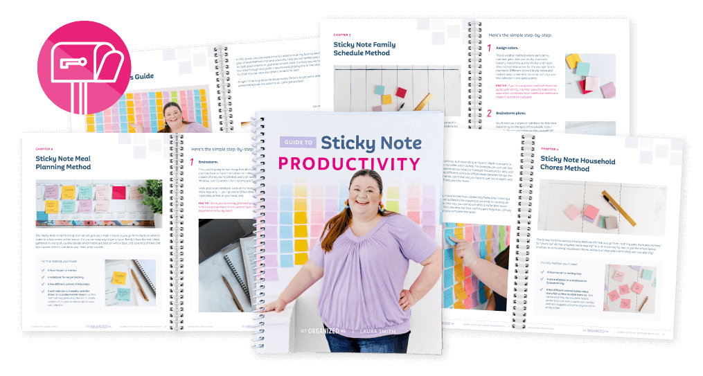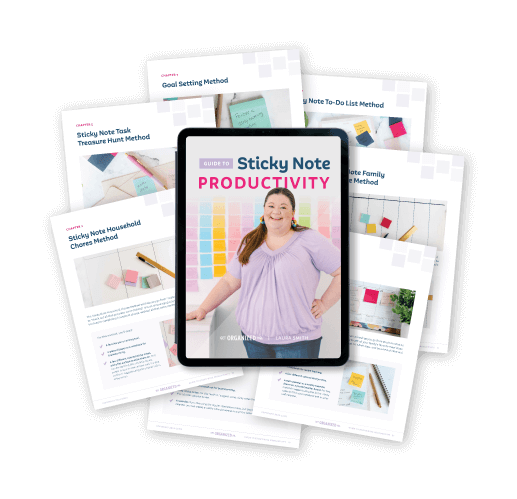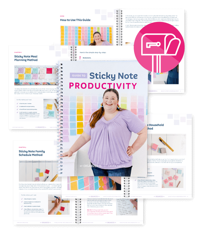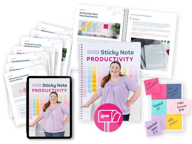This Guide is designed for you to print or access on your iPad/tablet. It does not come with sticky notes. You can use sticky notes you already have, or follow the suggestions we outline in the Guide. You can also check out our line of sticky notes in the Get Organized HQ Store and use the coupon code inside your guide for a discount.